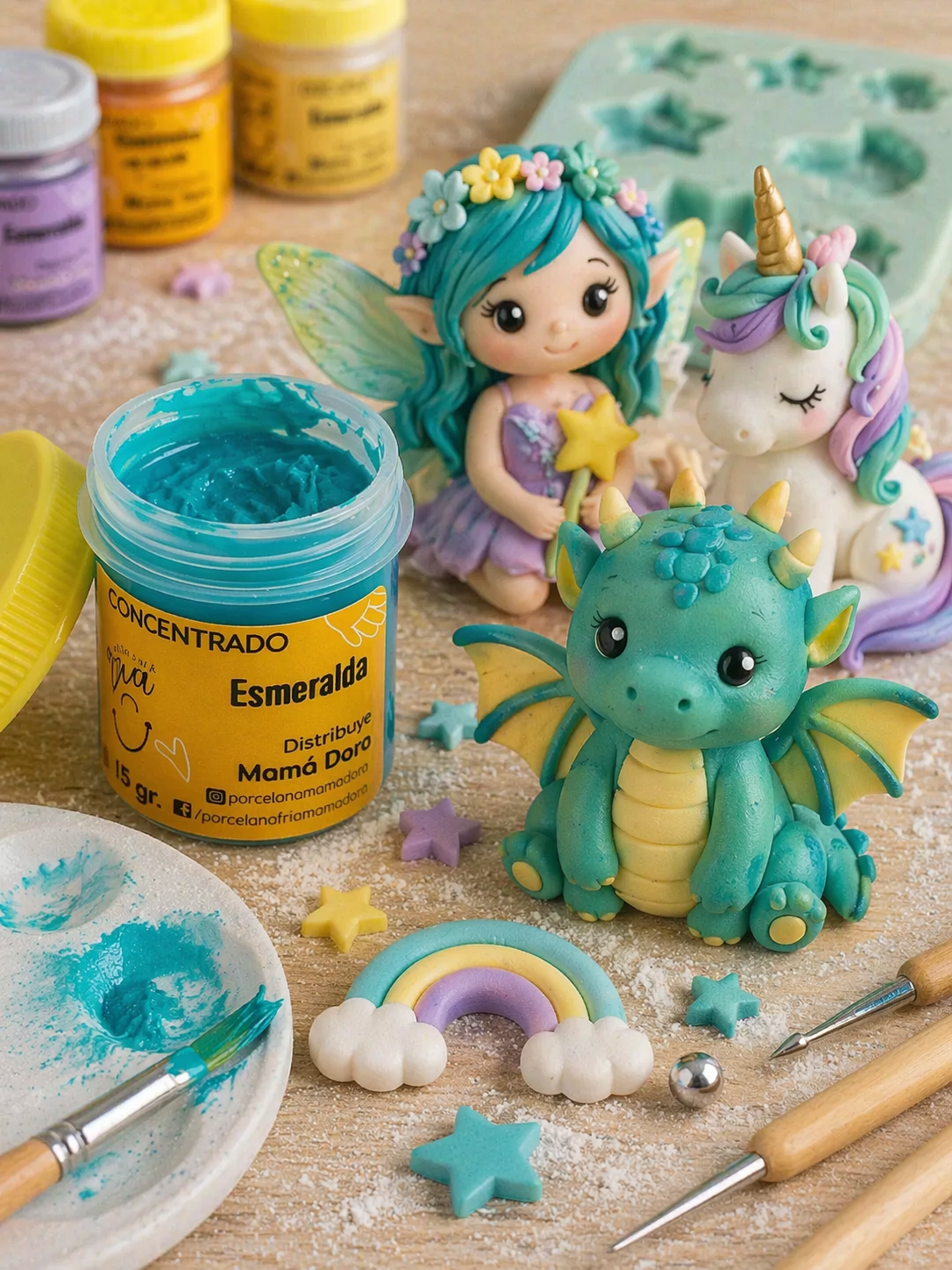 Los pigmentos Mamá Dora son reconocidos en el mundo de la porcelana fría y las artes manuales por su altísima concentración y pureza. Diseñados especialmente para teñir masas, ofrecen colores vibrantes y una mezcla homogénea sin alterar la consistencia del material.