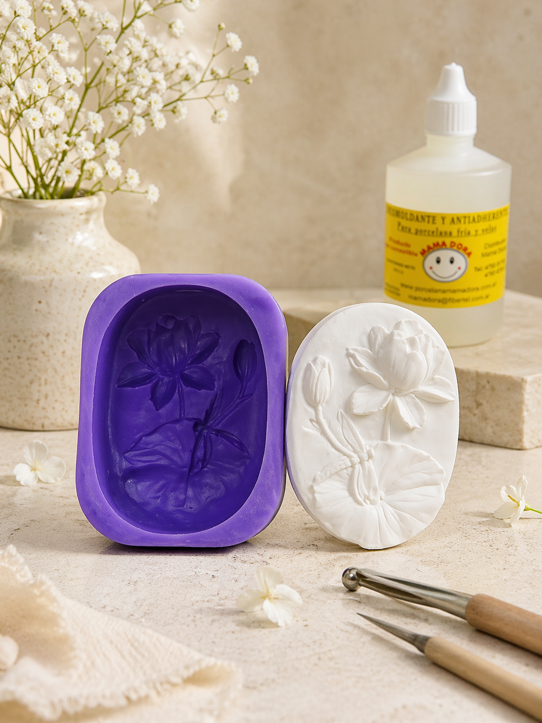 "Para los moldes con detalles muy profundos o letras finitas, podés poner apenas unas gotas del Desmoldante Antiadherente Mamá Dora dentro del molde antes de colocar la masa. Si usás porcelana fría, recordá desmoldar la pieza y dejarla secar sobre una superficie plana o esponja para que no pierda la forma mientras pierde humedad."